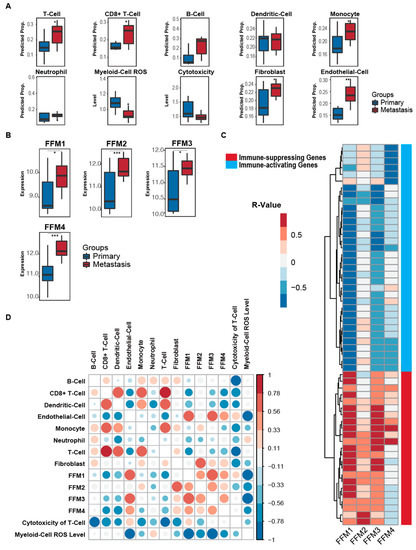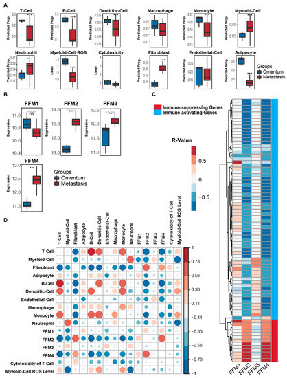 We started with analyzing the proportions of immune cells in ovarian cancer patient metastasis compared to matched primary tumors [41]. We observed a significant increase in the overall T-cell population in the metastasis along with increased cluster of differentiation 8 (CD 8) T-cells, monocytes and myeloid cell reactive oxygen species (ROS) production (p < 0.05 by Mann–Whitney test) (Figure 2A). All four FFM populations were found to be significantly higher in the metastatic tumors compared to the matched primary tumor (Figure 2B). This indicated increased desmoplasia occurring as ovarian cancer disseminates. We further confirmed our findings in another publicly available dataset [47], where FFM2 was significantly increased in the metastases compared to matched primary tumors, while the other FFMs displayed a non-statistically significant increase in metastases (Figure S3). Thereafter, we proceeded to specifically look for correlations between the four FFM subpopulations with tumor immunity-related genes in the metastatic tumors. Figure 2C shows the tumor immunity-related genes that are significantly associated with at least one FFM subpopulation (p < 0.05) (with complete statistics given in Tables S4 and S5). The genes were clustered (unsupervised) into immune-activating and immune-suppressing groups based on their functions. All the FFM groups positively correlated with the immune-suppressing genes and had a negative correlation with the immune-activating genes (Figure 2C, Tables S4 and S5). Taken together, this indicated that the increased desmoplasia in the metastatic tumors caused an inhibition of antitumor-immune responses while enhancing immune tolerance. A correlation analysis between cell types in the metastasis showed a similar trend in correlation of FFM1, 3 and 4 with the immune cells while FFM2 differed (Figure 2D). The former three negatively correlated with macrophages, dendritic cells and T-cells, while the latter had a negative correlation with the relative cytotoxicity of T-cells, MDSCs and neutrophils. Here, relative cytotoxicity of T-cells is defined by the log ratio of expression level of cytotoxic marker genes (perorin 1/granzymes) and total T-cell markers (CD2/CD3) [44].