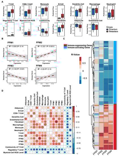 Analysis of stromal cellular composition of omental metastasis in human ovarian cancer patients with varying extent of disease spread in the omentum (GSE71340). (A) Comparison of the proportion of stromal cell types present in omentum with minimal metastases (omentum) and omentum with significant metastases (metastasis). (B) Scatter plots depicting the correlation between the expression of the 4 fibroblast functional modules (FFM1–4) with the extent of disease in the omentum specimen (disease score). (C) Heatmap showing the Spearman correlation of 4 fibroblast functional modules and immune-associated markers in tissues. Red or blue boxes indicate positive or negative correlation between the immune-associated marker and the corresponding fibroblast functional module (FFM1–4), respectively. Grey boxes indicate no correlation. Red and blue bars on the right depict the immune-suppressing and immune-activating markers, respectively. (D) A correlation analysis between the stromal cell types in the metastasis. The color scale for R-values are provided on the right. The sizes of the dots are also proportional to the magnitude of the R-value. *** p < 0.001.