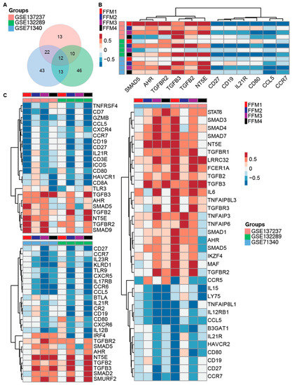 To identify the common immune-related genes that are deregulated during metastasis as compared to the primary tumors, as well as to the normal omentum, we compared the significantly deregulated genes from all three datasets (Figure 5A). Twelve genes were found to be common to all three comparisons that were potentially relevant to OC progression as well as reprogramming of the metastatic microenvironment. Further analysis of these 12 genes showed that the immunological functions of these genes generally correlated with the FFMs (Figure 5B). The six anti-inflammatory genes that had a positive correlation were predominated by the components of the TGF-β-signaling pathway. The proinflammatory genes negatively correlated with the FFMs. The two human datasets comparing primary tumors with matched metastases (GSE137237) and omentum metastases with adjacent normal omentum (GSE71340) had 34 differentially expressed immune-related genes in common (Figure 5A,C). The mouse metastasis vs. normal omentum data (GSE132289) shared 25 genes with the similar comparison in humans and 22 genes with the human primary tumors vs. metastasis (Figure 5A,C). Overall, our analysis suggested there was a positive correlation of the FFM subtypes with the anti-inflammatory genes and a negative correlation with the proinflammatory genes.