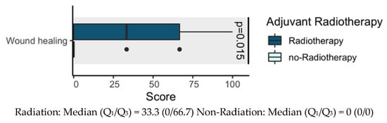 We assessed interaction between radiotherapy and wound healing. Therefore, we completed a t-test for comparison between these variables. Results showed interaction between radiotherapy and wound healing (p = 0.015). Given the potential adverse effects that radiotherapy has on wound healing, we noted that there was treatment burden, possibly because of wound hypoperfusion, that delayed wound healing processes. However, a low mean scale score for wound healing is provided in Figure 2. No p values are reported for other outcomes.