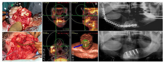 Fifty-seven-year-old male patient with a squamous cell carcinoma of the oral cavity (OCSCC) affecting the mandible reconstructed with the subscapular system free flap. (A) Intraoperative view of a large defect after navigated tumor resection; (B) Depiction of the 3D-navigation system based on PET/CT image-fusion, used perioperatively; (C) Postoperative dental panoramic radiograph after composite mandible reconstruction with the SFF. (D) Intraoperative view after insertion and fixation of the bony transplant of SFF reconstructing the mandible; (E) Postoperative dental panoramic radiograph after insertion of the dental implants.