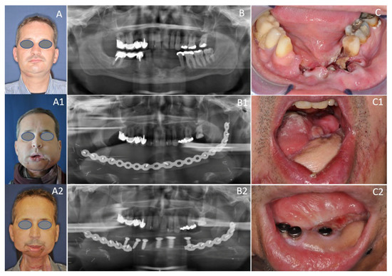 Fifty-four-year-old male patient with OCSCC reconstructed with the subscapular system free flap. (A) Preoperative status with perforating tumor on the right side; (B) Preoperative dental panoramic radiograph with large mandibular defect; (C) Preoperative clinical view with large OCSCC of the alveolar crest; (A1) Postoperative frontal view 10 days postoperatively; (B1) Postoperative dental panoramic radiograph displaying reconstructed mandible after insertion of the SFF. (C1) Postoperative clinical view enorally depicting the skin graft after composite mandible reconstruction with the SFF; (A2) Postoperative frontal view two years postoperatively; (B2) Postoperative dental panoramic radiograph displaying the mandible after insertion of implants; (C2) Postoperative clinical view enorally with placed implants.