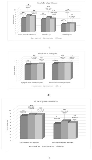 Compared to the pre-test, the mean confidence score of all participants was higher immediately after the course in both case and image questions (p < 0.001 for both) (Figure 3a). When the increase in confidence was analyzed, stratified by experience for those returning both questionnaires, it showed a higher increase for beginners across both parts of the assessment both in post- and follow-up tests. For the other groups, change in confidence levels remained statistically non-significant in follow-up test compared to the pre-course level, which might also be due to the low number of follow-up test takers in the intermediate and experts’ groups (Figure 3b,c).