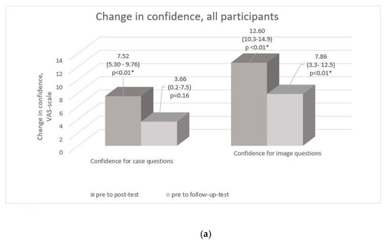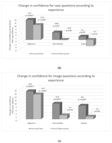 Results stratified by experience. Change in mean values for confidence (0 = not at all confident, 100 = very confident) in all questions (a) and separately for case questions (b) and image questions (c) according to experience. p-Value is presented with * if the change is statistically significant.
