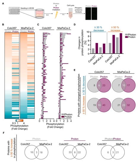 Changes in the phosphoproteome of 3D PDAC cell cultures by proton and photon irradiation. (A) Experimental set-up of phosphoproteome analysis; Alterations in phosphorylation sites upon irradiation are categorized into three ranges: (i) ≥30% decrease, (ii) ≥50% increase, (iii) ≤30% decrease + ≤50% increase. The latter is defined as ‘no change’ (see Tables S3 and S4). Data falling into the categories (i) and (ii) are plotted as (B) heatmaps and (C) waterfall blots after normalization to unirradiated controls (n = 1); (D) Percentage of phospho-sites among all detected 584 phospho-sites showing ≥30% decrease or ≥50% increase in phosphorylation after irradiation in indicated cell lines; (E) Venn diagram analysis indicating overlapping and specific alterations in phospho-sites after photon or proton irradiation; (F) Venn diagram analysis comparing proteins altered by ≥50% increase in phosphorylation of Colo357 and MiaPaCa-2 cell lines, either specifically after photons and protons or by both kinds of irradiation.