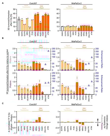 We subsequently conducted a screen with inhibitors deactivating either RTK signal transduction (EGFRi, MAPKi, MEKi, PI3Ki, VEGFRi) or DNA repair processes (ATMi, DNA-PKi, MDM2i, Mre11/Rad50/Nbs1 protein complex (MRNcomplexi), PARPi, Rad51i). While 3D tumoroid growth of Colo357 cells was diminished upon EGFRi, VEGFRi and Rad51i, MiaPaCa-2 tumoroid growth remained unaffected (Figure 4A). Cell-line-dependently, signal transduction inhibitors elicited 3D tumoroid growth reduction in both tested cell lines upon irradiation (Figure 4B and Figure S5). PI3Ki showed the strongest effect in both cell lines (Figure 4B and Figure S5). Interestingly, Colo357 and MiaPaCa-2 cells responded differently to MRNcomplexi upon proton irradiation relative to photons (Figure 4B and Figure S5). Pretreatment with Rad51i led to a radioprotection in MiaPaCa-2 cells (Figure 4B and Figure S5). In contrast, PARPi, DNA-PKcsi and ATMi were the most efficient regarding reduction in tumoroid growth (Figure 4B and Figure S5). The similarity of the radiosensitizing efficacy of the different signal transduction and DNA repair inhibitors for photons and protons is visualized in Figure 4C.