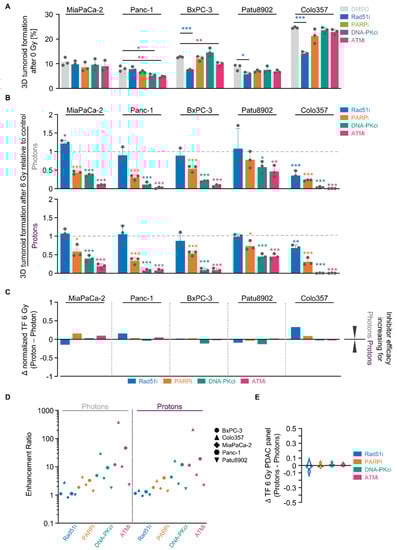 The DNA damage response, in general, plays a pivotal role in tumor cell survival and the associated DNA repair enzymes are considered as ideal therapeutic targets. We next sought to confirm the different DNA repair inhibitor efficacies for radiosensitization in our larger PDAC cell line panel. Single pharmacological inhibition of Rad51, PARP, DNA-PK and ATM indeed echoed the results observed in the Colo357/MiaPaCa-2 cell model screen (Figure 5A). Overall, and similar to our screen, we discovered the following increasing 3D PDAC tumoroid reduction for photons as well as protons: Rad51i < PARPi < DNA-PKcsi < ATMi (Figure 5B and Figure S6). Although differing in their absolute values among the tested PDAC cell lines, the discrepancies between photons and protons turned out to be minor, ranging between approximately −0.2 and 0.3 (Figure 5C). This notion is also visualized in Figure 5D, in which the enhancement ratios of all conditions are plotted. Moreover, these results are underpinned by taking together the differences in the radiation response to photons and protons of the whole PDAC cell line panel. Indicated by Δ values close to zero, the reduction in tumoroid growth after HR and NHEJ inhibition presented as largely independent from radiation type (Figure 5E).