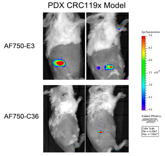 2.6. The E3 Aptamer Targets PDX Colorectal Tumors In Vivo