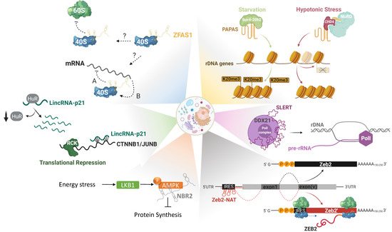 LncRNAs in translation regulation. In the nucleus, lncRNAs PAPAS and SLERT regulate ribosome biogenesis through regulation of rRNA transcription, while Zeb2-NAT by base-paring to its sense coding gene Zeb2, causes inclusion of an IRES thus leading to its translation. In the cytoplasm, lncRNAs ZFAS1 binds the small ribosomal subunit and may have a role in mRNA translation. NBR2 attenuates global translation by interacting with AMPK and promoting its kinase activity. LincRNA-p21 regulates specific mRNA-targets by promoting their interaction with the translational repressors.