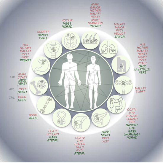 LncRNAs involved in different cancer types. Main examples of lncRNAs with oncogenic (red) or tumor-suppressive (green) properties reported in different tumors (i.e., clockwise from top left: neuroblastoma, melanoma, lung c., breast c., ovarian c., colon c., pancreatic c., hepatocellular c., prostate c., osteosarcoma, leukemia, gastric c., papillary thyroid c.). AML = acute myeloid leukemia; APL = acute promyelocytic leukemia; CML = chronic myeloid leukemia.