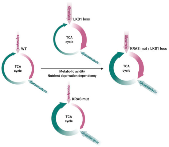 Schematic overview summarizing the enhanced metabolic avidity and nutrient deprivation sensitivity of KRAS and LKB1 co-mutated tumors compared to wild type (WT) or single mutated NSCLCs. Violet arrows refer to glycolysis and its exploitation in the tricarboxylic acid (TCA) cycle, while green arrows represent glutaminolysis and the TCA cycle fueled by this process. The thickness of the arrows shows the dependency of the two different processes according to the different backgrounds. The black arrow represents the increase in metabolic avidity and nutrient deprivation dependency according to the different genotypes. Adapted from [25].