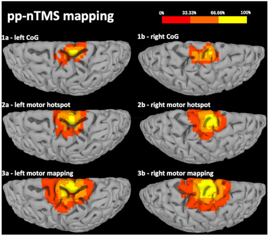 Navigated transcranial magnetic stimulation (nTMS) has developed into a reliable preoperative tool to map the motor cortex in patients harboring motor-eloquent brain lesions [1,2,3,4]. Specifically, nTMS motor mapping allows to identify and spatially enclose the somatotopic cortical representations of face, upper extremity (uE), and lower extremity (lE) muscles (e.g., gastrocnemius and tibialis anterior muscle) [5,6]. It has repeatedly demonstrated high accuracy, with distances between motor hotspots derived from nTMS and intraoperative direct electrical stimulation (DES)—the gold-standard method for functional mapping—ranging within the inaccuracy of the neuronavigation system [1,2,3,4]. Furthermore, the seamless combination of nTMS motor maps with diffusion tensor imaging (DTI) and intraoperative neuronavigation environments enables additional tractography of the corticospinal tract (CST) purely based on functional data [6,7,8,9,10,11]. Hence, detailed presurgical assessment of the patient’s individual motor system becomes feasible and has shown potential to improve surgical outcome [12,13,14,15].