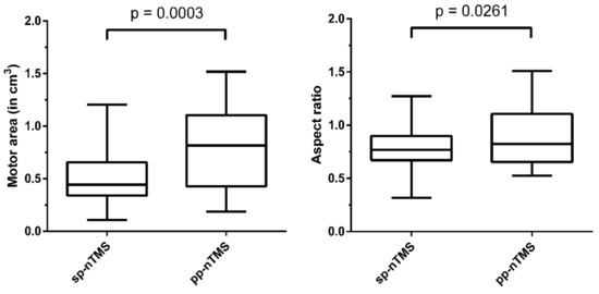 The volume of the motor area was significantly higher for pp-nTMS when compared to sp-nTMS (p = 0.0003). Regarding the aspect ratio, significantly higher values were found for pp-nTMS when compared to sp-nTMS (p = 0.0261), indicating that the motor map was more elongated in the direction of the electric field for pp-nTMS. Figure 3 and Figure 4 plot the motor area volume and aspect ratio.