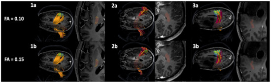 Tractography of the corticospinal tract (CST). This figure illustrates three example patient cases (1, 2, and 3) for diffusion tensor imaging fiber tracking (DTI FT) of the CST using motor maps derived from single-pulse navigated transcranial magnetic stimulation (sp-nTMS; blue points) and paired-pulse nTMS (pp-nTMS; green points) for tractography with a fractional anisotropy (FA) of 0.1 (a) and 0.15 (b), respectively. The CST tracked by using sp-nTMS motor maps is highlighted in red, the CST derived from tracking with pp-nTMS motor maps is shown in orange.