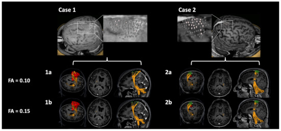 Patient cases with motor maps derived from paired-pulse navigated transcranial magnetic stimulation (pp-nTMS) only. This figure depicts two example patient cases (1 and 2) in whom pp-nTMS motor mapping yielded a motor map whilst single-pulse nTMS (sp-nTMS) failed. The motor map and corresponding diffusion tensor imaging fiber tracking (DTI FT) of the CST is shown, using a fractional anisotropy (FA) of 0.1 (a) and 0.15 (b) for tractography. Motor maps are shown in red or green, the CST is depicted in orange.