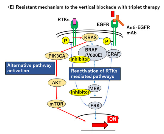 How can we possibly improve upon the vertical blockade strategy? Initially, insufficient suppression of the RAS–RAF–MEK–MAPK pathway, as described above, was thought to account for the unsatisfying results with the vertical blockade; however, pharmacodynamic analysis of paired tumor specimens, before and after treatment, revealed that the degree of MAPK pathway suppression is not correlated with the clinical outcomes [165]. On the one hand, doublet therapy with trametinib and Pmab (T+P) could reduce the pERK level significantly, but no responder to this doublet regimen was found. On the other hand, doublet therapy with dabrafenib and Pmab (D+P) could not reduce p-ERK sufficiently and the median p-ERK level of the D+P regimen was higher than that of T+P. Despite the weaker suppression of the MAPK signaling pathway, a higher response rate (10% vs. 0%) and longer PFS (3.5 months vs. 2.6 months) were observed in patients treated with the D+P regimen for unknown reasons [165]. Western blotting analysis of the phosphorylation of MEK or ERK may not be the right assay to evaluate the activity of this RAS–RAF–MEK–MAPK pathway. The plastic and reversible nature of this pathway makes it difficult to overcome the associated malignancy. Resistance can be caused by the compensatory reactivation of the MAPK pathway, through the acquisition or preexistence of RTK amplification (not only EGFR, but also HER2, HER3 or MET), RAS mutation or RAS amplification, BRAF amplification, and MEK mutation, which could cause resistance to the BRAF inhibitor [8,9,151,163,165,170,171,172,173]. For instance, while the BRAF and RAS mutation are initially found in a mutually exclusive manner, these tumors additionally acquire NRAS or KRAS mutations after vemurafenib treatment, as indicated by the analysis of their circulating tumor DNA (ctDNA) [138]. In addition, Pietrantonio and Oddo et al. reported the case that combination therapy with crizotinib (MET inhibition) could transiently overcome the acquired resistance after BRAF inhibition, but MET hyper-amplification emerged as a second acquired resistance [172,173]. It seems therefore that the heterogeneous and plastic nature of the RTK signaling pathway prevents us from conquering this malignancy.