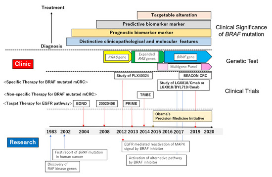 The cancer precision medicine era became a tailwind in raising awareness of the significance of BRAF-mutated CRC in clinical practice. A low incidence of the BRAF mutation had been the critical hazard preventing BRAF gene testing from entering clinical practice. Next generation sequencing (NGS) technology opened the door for comprehensive molecular analyses of cancer genomes with much higher speed and lower costs [128]. A gene mutation that recurrently appears in cancer genomes can be considered as a “driver mutation” candidate and is, therefore, a target in the precision medicine era. Clinical sequencing in the search for the driver genetic alterations has been widely conducted [6,7,129], and molecular targeting agents, mainly inhibitors, have been developed to suppress these. To overcome the low incidence, umbrella- or basket-type clinical trials enable a patient with a rare driver mutation in a specific organ to efficiently receive the targeted therapy [129], including mCRC patients with the BRAF mutation. BRAF gene testing had reached the bedside from the bench-side in the wind of cancer precision medicine.