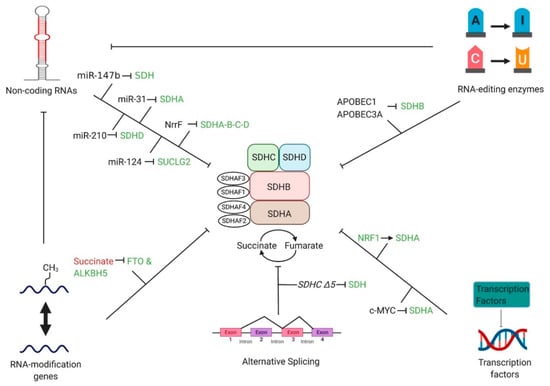 Succinate dehydrogenase (SDH) is a mitochondrial enzyme present in supporting metabolic function through the tricarboxylic acid cycle (TCA cycle) and the electron transport chain (ETC). The enzyme works by catalyzing succinate to fumarate by oxidation in the TCA cycle, then ubiquinone is reduced to ubiquinol in the ETC []. As a part of the TCA cycle, SDH gains electrons and transfers them through the four subunits (SDHA, SDHB, SDHC, SDHD) and continues this electron transfer through the ETC as complex II. The electrons from FADH2 and reduced ubiquinone are transferred to complex III to continue the production of adenosine triphosphate. This produces the energy for the cell. With the regulation of this enzyme through its various complexes, the cells are able to perform cellular respiration, hypoxic response, and other cellular activities such as gene expression. However, altered SDH activity could give rise to disease and cancer development due to reduced electron flow, increased oxygen toxicity, and accumulated succinate. Due to the various subunits within the SDH complex, the difference in functionality can be responsible for these metabolic changes. In some human cancer cells, SDH demonstrates tumor-suppressive properties by inactivating hypoxia-inducible factor 1α (HIF-1α) via reduced succinate []. Additionally, the subunits of SDH can interact with ribonucleic acid (RNA) regulatory networks including non-coding RNAs, RNA-editing enzymes, RNA-modifying enzymes, transcription factors, and small molecules. A consequence of RNA modifications and deregulation of non-coding RNAs is the ability to act as tumor suppressors or oncogenes and alter gene expression, dysregulate cell signaling pathways, and alter cell metabolism [,]. Among them, non-coding RNAs can target SDH and contribute to complex dysfunction [,]. Additionally, SDH can be influenced by non-coding RNAs that are regulated by RNA-editing [] and RNA-modifying enzymes [] as well as transcription factors that have been found to contribute to various cancers. To combat the effects induced by SDH mutations or metabolic dysfunctions, multiple molecules including SDH inhibitors and activators are evaluated in current pre-clinical models and clinical trials. Here, we summarize the SDH-relevant physiological and pathological mechanisms as well as diseases including cancer. Additionally, we discuss innovative ways that RNA networks influence SDH state and promising strategies for targeting the SDH complex.