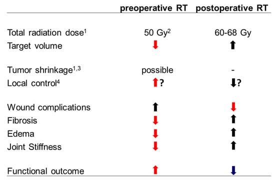 The addition of RT to the surgical standard approach of wide resection undoubtedly results in increased local control based on randomized trials, meta-analyses, and large population-based studies in general [1,2,3,4], while its impact on survival is unclear [5,6]. However, the magnitude of the gain depends on several factors including resection margin, grading, size, localization, and histological subgroup. Thus, administration of RT must be weighed carefully against the anticipated acute and late toxicities with special regard to long-term functional outcome [4,7]. Data from the Scandinavian database indicates that the benefit in local control increases continuously with narrowing margins (especially if microscopic or even macroscopic residual disease is present or anticipated), higher grading and deep localization [4]. Small (<5 cm), superficial, low grade STS with wide margins represent the part of the spectrum with the lowest risk and the lowest benefit from the addition of radiation while large, deep seated, high grade STS with narrow or positive margins represent the part with the highest risk and benefit from adding RT [4]. Therefore, based on current international guidelines, the indication for additional RT is usually the strongest in patients with high grade lesions, while in low grade lesions RT is usually reserved for patients with (anticipated) positive margins or locally recurrent situations without prior RT [8,9]. Perioperative RT is usually administered via external beams (EBRT) and can be administered pre- or postoperatively. The only randomized trial directly comparing both approaches did not observe any significant differences in oncological outcomes but found distinct differences with regard to side effects [2,10]. While preoperative radiation therapy resulted in a doubled rate of major wound complications, all other side effects, especially late toxicities, were reduced compared to the postoperative approach. This is of major interest as late side effects like fibrosis, edema, and joint stiffness may severely affect the long-term functional outcome. The reduced late toxicity is probably related to the smaller irradiated volumes (due to easier target volume definition and the possibility for smaller safety margins) and the lower doses (probably due to a better tissue oxygenation) used during preoperative EBRT [10]. Preoperative radiation further includes the possibility of tumor shrinkage at least in radiosensitive histological subgroups [11] and prevents patients with postoperative complications from getting no radiation at all. A recent meta-analysis including eight trials with >1600 patients further described significantly increased local control and survival using the preoperative approach [3]. Therefore, current guidelines increasingly support the use of neoadjuvant EBRT [8], although the optimal timing should be evaluated individually. The pros and cons of preoperative and postoperative EBRT are summarized in Figure 1.