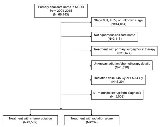 Patients diagnosed with stage I SCCA from 2004–2015 were collected from the NCDB participant user file with additional inclusion and exclusion criteria summarized in Figure 1. We excluded patients that received only a surgical procedure without RT or CRT. Additional exclusion criteria included non-squamous histology, patients with unknown radiation and chemotherapy treatment details, and patients who received radiation therapy doses >59.4 Gy or <45 Gy.