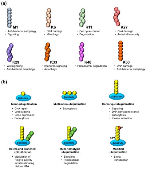 - Akutsu, M.; Dikic, I.; Bremm, A. Ubiquitin chain diversity at a glance. J. Cell Sci. 2016, 129, 875–880. [Google Scholar] [CrossRef]