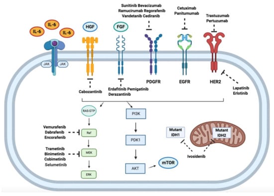 Schematic figure reporting therapeutically relevant signaling pathways and selected targeted therapies currently under evaluation for biliary tract cancer. AKT: protein kinase B; EGFR: epidermal growth factor receptor; FGF: fibroblast growth factor; HER2: epidermal growth factor receptor 2; HGF: hepatocyte growth factor; IL-6: interleukin 6; IDH: isocitrate dehydrogenase; JAK: Janus kinase; mTOR: mammalian target of rapamycin; PDGFR: platelet derived growth factor receptor; PDK1: phosphoinositide-dependent kinase-1; PI3K: phosphoinositide 3-kinase.