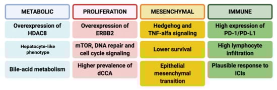 Aberrations in the human EGFR gene family are among the most frequent potentially actionable targets detected in non-intrahepatic forms so far, occurring in approximately 20–25% of GBCs and the 15% of eCCAs [35,36]. Other potentially druggable mutations in eCCA include PIK3CA, NTRK, and BRAF, reported in around 7%, 4%, and 2% of cases, respectively [37,38]. A recent international multicenter collaboration performed an integrative genomic analysis of 189 cases of eCCA including whole-genome expression, immunohistochemistry, and targeted DNA-sequencing; it was observed that the most frequent mutations in eCCA included KRAS (36.7%), ARID1A (14%), and SMAD4 (10.7%) [39]. Moreover, the analysis suggested the presence of four distinct transcriptome-based molecular subclasses of eCCA with potentially targetable genomic alterations, which can be classified as follows: Metabolic class, Proliferation class, Mesenchymal class, and Immune class (Figure 3).