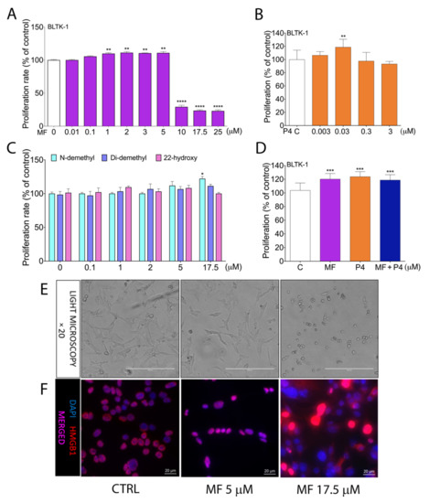We analyzed the effects of MF (0.01–25 µM concentration) and P4 (0.003–3 µM concentration) on the proliferation of two independent Leydig tumor cell lines, BLTK-1 and mLTC-1. Low levels, up to 5 µM of MF (Figure 1A, Figure S2A), as well as 0.03 µM of P4 in BLTK-1, and 0.03 µM and 0.3 of P4 in mLTC-1, increased cell proliferation (Figure 1B, Figure S2B), whereas the higher doses of MF, but not of P4, significantly inhibited the cell proliferation in both cell lines. N-demethyl MF at a concentration of 17.5 µM significantly stimulated cell proliferation, whereas the other MF metabolites (Di-demethyl and 22-hydroxy MF) did not affect the BLTK-1 cell proliferation (Figure 1C). We also found that MF treatment did not inhibit the P4-enhanced proliferation of BLTK-1 cells (Figure 1D).