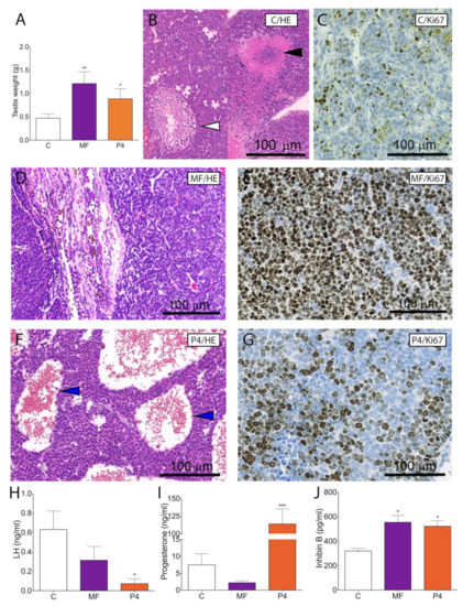 Histopathological analyses demonstrated in non-treated LCTs severe cellular atypia, only a few peripheral tubular structures with spermatogenic cells up to elongated spermatids and in some regions rapid tumor growth with necrosis (Figure 2B). The P4- and MF-treated LCTs showed overall destroyed histological morphology with blood-filled cavities, infiltrating lymphocytes, and with almost no normal testicular structures left (Figure 2D,F). We confirmed LCT progression after MF and P4 treatment by increased Ki67-positive cells to 60–80% vs. 40% in the non-treated group (Figure 2C,E,G).
