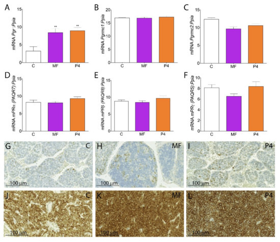 The MF and P4 treatments significantly increased Pgr expression in LCTs (Figure 3A) but did not affect the expression of any of the membrane PR (Paqr5, Paqr7, Paqr8, Pgrmc1, Pgrmc2) (Figure 3B–F). Immunohistochemical studies demonstrated a weak expression of Pgr (Figure 3G–I) but abundant Pgrmc1 in non-treated, MF-, and P4-treated LCTs (Figure 3J–L). BLTK-1 cells expressed all types of PRs at the mRNA level, however the expression of PGR and mPRγ at the protein level was weak (Figure S4, Table S1). No Pgr and weak mPRγ expression was detected in mLTC-1 cells (Figure S4, Table S1).