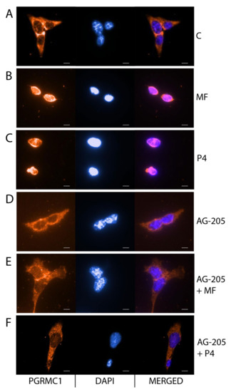 MF and P4 treatments effects on the nuclear translocation of PGRMC1 in BLTK-1 cells. Immunocytochemical localization of PGRMC1 without C (A) or with MF (B), P4 (C), AG-205 (D), AG-205 + MF (E) and AG-205 + P4 (F) in BLTK-1 cells. Scale bar, 20 μm. AG-205, PGRMC1 inhibitor; C, control; MF, mifepristone; P4, progesterone.