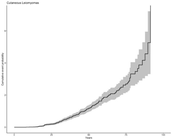The following are available online at https://www.mdpi.com/2072-6694/12/11/3277/s1, Figure S1: Cumulative incidence of cutaneous leiomyomas by variant type. Light-colored areas represent confidence intervals, Figure S2: Cumulative incidence of uterine leiomyomas by variant type. Light-colored areas represent confidence intervals, Figure S3: Cumulative incidence of renal cysts, Figure S4: Cumulative incidence of renal cysts by variant type. Light-colored areas represent confidence intervals, Table S1: FH germline variants classifications and phenotype characteristics of HLRCC families, Table S2: Univariate analysis for cutaneous leiomyomas, uterine leiomyomas, renal cysts, renal cell cancer and risk factors, Table S3: Multivariate logistic regression model for cutaneous leiomyomas, uterine leiomyomas, renal cysts, renal cell cancer and risk factors.