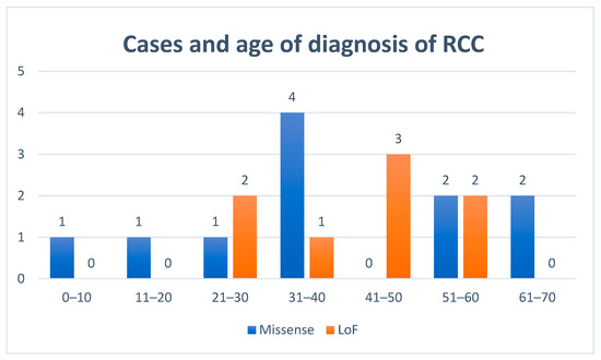 Of 175 patients with confirmed clinical information, 19 presented with RCC (10.9%), 11 men and eight women; fourteen were index cases. Seven of them also presented with RCys. One patient was diagnosed with two synchronous bilateral RCCs. The median age at diagnosis was 37.4 years ((IQR 30.2–53.2), range 10–67) (Figure 3). Ten cases were heterozygote carriers of the pathogenic variant c.1118A > G; p.Asn373Ser, three of them at a very early age (a boy at 10 years, a young man at 20 years and a woman with bilateral RCCs at 24 years). No significant differences were observed according to the type of variant, sex, blood pressure status, tobacco use or obesity in the univariate and multivariate logistic regression model, but those undertaking vigorous physical activity showed a non-significant trend to develop RCCs in the multivariate logistic regression model (p = 0.067) (Tables S2 and S3).