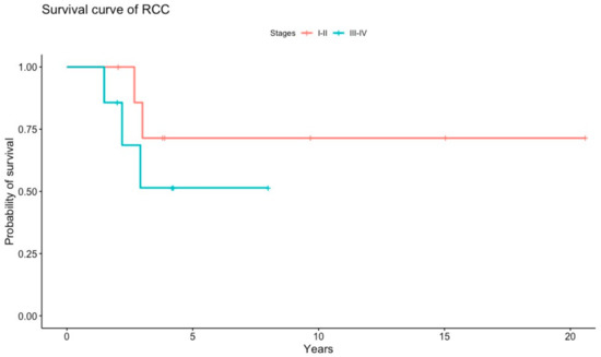 Kaplan-Meier estimates of overall survival of patients with renal cell cancer stages I and II vs. stages III and IV. RCC, renal cell cancer.