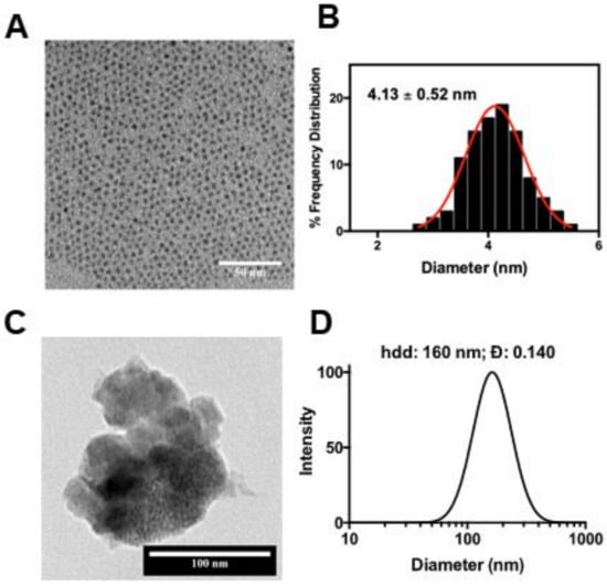 Size and morphology of nanoparticles. Transmission electron microscopy (TEM) image (A) of the synthesized usNP and the corresponding size distribution is shown (B). (C) TEM image of the synthesized BSA-usNP-MnO2 and the corresponding hydrodynamic size (D).