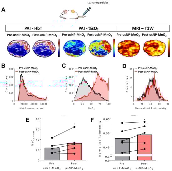 Modulation of hypoxia in head and neck squamous cell carcinomas (HNSCC) xenografts following systemic delivery of H2O2 responsive usNP-MnO2. (A) The panel of images represent co-registered Hbt (left), %sO2 (middle) and normalized T1-intensity maps (right) of an HNSCC patient-derived xenograft (PDX) before and after intravenous (i.v.) administration of H2O2 responsive usNP-MnO2. Corresponding histograms of hemoglobin concentration (Hbt; B), %sO2 (C), and T1-intensity (D) before and following usNP-MnO2 nanoparticle injection are shown. Graphs show increases in tumor %sO2 (E) and normalized T1W intensity (F) following nanoparticle injection, * indicates p < 0.05.