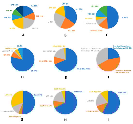 Molecular and phenotypic heterogeneity of Triple Negative breast cancer (TNBC): (A) pie chart showing frequencies and molecular TNBC type-6 classification (according to Lehmann et al. 2011) [13]; (B) pie chart displaying frequencies and molecular TNBC type-4 classification (according to Lehmann et al. 2011) [41]; (C) TNBC assigned to intrinsic molecular breast cancer (BC) subtypes (according to Lehmann et al. 2011) [13]; (D) pie chart showing molecular subclassification and frequencies of basal-like phenotype (BLP) in TNBC (according to Prat et al. 2013) [44]; (E) pie chart displaying molecular subclassification and frequencies of TNP in BLBC (according to Prat et al. 2013) [44]; (F) pie chart showing the fuzzy clustering of TNBC (according to Jezequel et al.) [45]; (G) pie chart displaying the probabilistic graphical model of TNBC (according to Prado-Vazquez et al.) [42]; (H) pie chart showing the overlapping between the probabilistic graphical model of TNBC and the immune activity negative group (according to Prado-Vazquez et al.) [42]; and (I) pie chart displaying the overlapping between the probabilistic graphical model of TNBC and the immune activity-positive group (according to Prado-Vazquez et al.) [42]. BL, basal-like; BL1, basal-like 1; BL2, basal-like 2; CLDN, Claudin; HER2, human epidermal growth factor receptor 2; HR−, hormone receptor negative; HR+, hormone receptor positive; IM, immunomodulatory; LAR, luminal AR; M, mesenchymal; MSL, mesenchymal stem-like; NBC, non-basal-like; NL, normal-like; and UNS, unstable.
