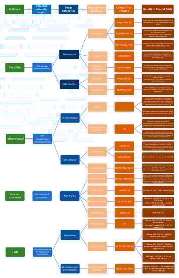 Molecular differences identified in TNBCs might be valuable for biomarker identification, drug discovery, and clinical trial design and could support the variations in histological types, prognosis, and patient’s outcome characterizing each TNBC molecular subtype. Notwithstanding some divergences, the TNBC molecular classifications previously discussed provide adequate evidence that there are four major subtypes demanding subtype-specific biological-based therapies. Predicted “driver” signaling pathways were pharmacologically targeted in clinical trials to prove if gene expression signatures can impact therapy selection (Figure 2).