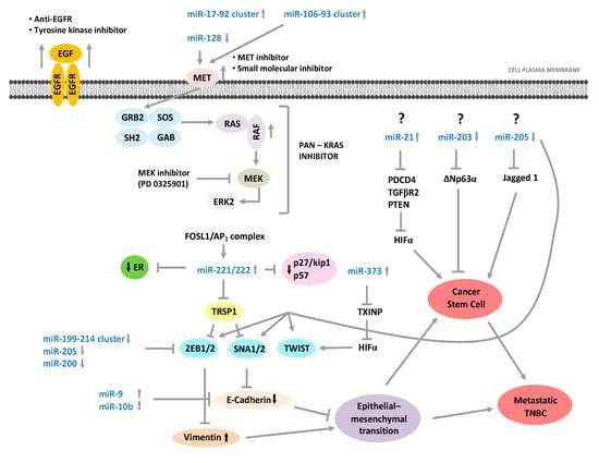 MiR-221/222 is a cluster located on the X chromosome, where genomic abnormalities related to the BLBC pathogenesis often occurs. MiR-221/222 are at a 1 kb genomic distance with the same orientation and probably co-regulated [115]. This gene group is associated with EMT promotion, downregulation of ER, and tamoxifen resistance in BC [116]. MiR-221/222 have been recognized as BL-subtype-specific TNBC miRNAs, of which the overexpression reduced levels of epithelial-specific genes and improved mesenchymal-specific genes, favoring cell migration/invasion in an EMT characteristic manner. The transcriptional factor FOSL1, found in BLBC but not in luminal subtypes, expanded the transcription of miR-221/222, while their downregulation has been induced by EGFR or MEK inhibitors, placing miR-221/222 downstream of the RAS pathway. This model revealed that miR-221/222 overexpression is controlled by the EGFR/RAS/RAF/MEK/ERK2/FOSL1 axis and stimulates EMT by targeting TRPS1, which suppresses ZEB2, leading to E-cadherin downregulation. Because of the overexpression of miR-221/222, ZEB2 increases, permitting E-cadherin repression and vimentin upregulation promoting EMT [117].