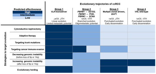 As previously described, seven evolutionary trajectories can be distributed into four groups depending on the tumor’s genomic characteristics, evolution mode, and clinical course. We suspect that each group has its own unique weaknesses that could be exploited. In Figure 1, we demonstrate the predicted effectiveness of evolution-targeted strategies against particular evolutionary trajectories of ccRCC.