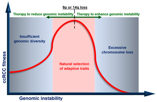 Modulating genomic instability to reduce ccRCC fitness. ccRCC fitness (vertical axis) is plotted against genomic instability (horizontal axis). There is an optimum range of genomic instability, in which ccRCC evolves. 9p or 14q loss represents the acquisition of metastatic competence and is a point of no return. Before this point is reached, decreasing genomic instability slows down cancer evolution. Once 9p or 14q is lost, increasing genome instability triggers extensive DNA damage and cell death.