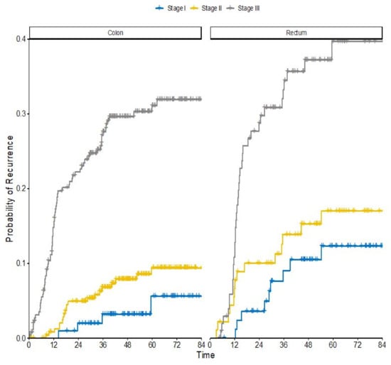 - Pugh, S.A.; Shinkins, B.; Fuller, A.; Mellor, J.; Mant, D.; Primrose, J.N. Site and Stage of Colorectal Cancer Influence the Likelihood and Distribution of Disease Recurrence and Postrecurrence Survival: Data From the FACS Randomized Controlled Trial. Ann. Surg. 2016, 263, 1143–1147. [Google Scholar] [CrossRef]