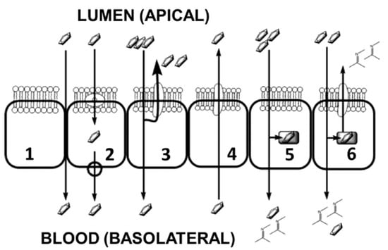 Graphical representation of the six epithelial transport characteristics for the uptake of cytotoxic compounds from oral administration, adapted from Chan et al. [37]. 1—Paracellular absorption via the interstitial spaces between cells, this is restricted by intercellular tight junctions. 2—Transport mechanisms at either the apical or the basolateral membranes. 3—Restriction of transport into the blood flow by apical membrane efflux transporters. 4—Efflux membrane transporters enabling clearance of compounds from the blood. 5—Metabolism of compounds prior to transport to the blood. 6—Co-ordination of metabolizing enzymes and apical efflux transporters forming an intestinal absorption barrier.