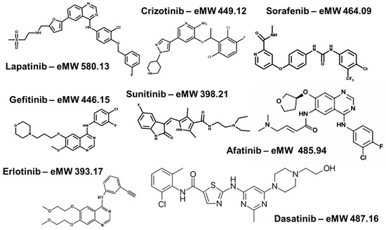 From seven FDA approved compounds (gefitinib, erlotinib, sorafenib, sunitinib, dasatinib, afatinib, and crizotinib; Figure 2 and Table 1), we determined perfusion coefficients using the Transwell system. Gefitinib and erlotinib are first-generation reversible small molecule inhibitors of the epidermal growth factor receptor (EGFR) tyrosine kinase. Afatinib is a second-generation small-molecule inhibitor also targeting EGFR [40]. The drugs are registered for the treatment of adenocarcinoma of non-small cell lung cancer (NSCLC) with activating EGFR mutations. Sorafenib and sunitinib are orally active multikinase inhibitors approved for the treatment of hepatocellular carcinoma and renal cell carcinoma, respectively [41,42]. Crizotinib is an echinoderm microtubule-associated protein-like 4 (EML4)-anaplastic lymphoma kinase (ALK) and cMET inhibitor that has been approved for use in NSCLC [43], while dasatinib is a platelet-derived growth factor receptor/breakpoint cluster region-Abelson murine leukemia oncogene homolog-1; (PDGFR/BCR-Abl) inhibitor registered for use in chronic myeloid leukemia in a selected population [44]. Physicochemical properties of these compounds determine whether they are good substrates for various influx- and efflux transporters, responsible for intestinal uptake, or whether they may compartmentalize in cellular organelles leading to resistance [45].