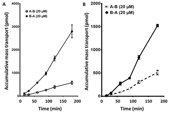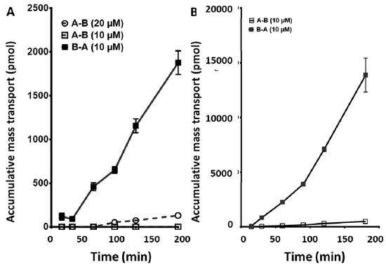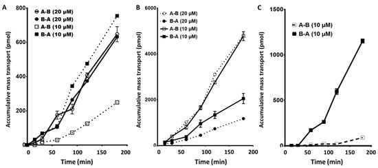 Cumulative transport of gefitinib (A), erlotinib (B), and afatinib (C) across a CaCo2 monolayer at both 10 and 20 µM concentration in the apical to basolateral (A–B) and the basolateral to apical (B–A) directions. Values are the mean ± standard error of the mean of 3 replicates. When not visible, the error bars are within the size of the marker.