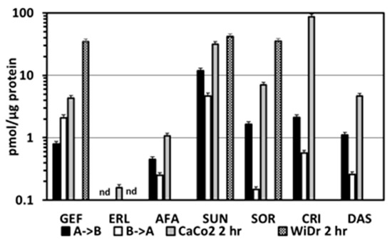 Accumulation of the TKIs in CaCo2 cells harvested at the end of the mass transport experiments in comparison to TKI accumulation in CaCo2 cells and WiDr colon cancer both grown as normal monolayers. These cells were exposed to 20 μM of a TKI and were harvested after 2 h for determination of TKI concentration with LC-MS-MS. Values are means ± SEM for the number of experiments described in Figure 3, Figure 4, and Figure 5 and from three separate experiments for the monolayer CaCo2 and WiDr cells. GEF, gefitinib; ERL, erlotinib; AFA, afatinib; SUN, sunitinib; SOR, sorafenib; CRI, crizotinib; DAS, dasatinib; nd, not detectable. A->B, mass transport from A to B; B->A, mass transport from B to A. For AFA, CRI, and DAS, no data in WiDr cells were available.