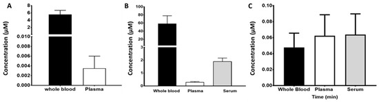 In 32 NSCLC patients treated with erlotinib, steady-state concentrations of plasma and serum were determined as well as whole blood for five patients (Figure 7B). The concentrations of erlotinib in plasma were significantly (p < 0.05) lower compared to that in whole blood and serum. The data suggest that red blood cell uptake of erlotinib is a variable not considered in all the published pharmacokinetic studies and could be a key factor behind inter- or intrapatient variability.