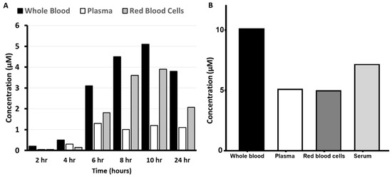 Sorafenib demonstrated a 2–4-fold increase in the concentration of the drug in the whole blood compared to the plasma, which was observed in several patients at this low dose (Figure 8B). However, at higher doses (2000–2800 mg cumulative daily dose), the whole blood/plasma ratio decreased to 1.2 ± 0.4 (mean ± SD of 12 patients). There was no difference in the ratio between the three cycles given to these patients.