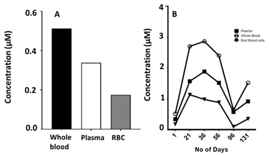 In six patients with non-small cell lung cancer (NSCLC) treated with gefitinib, corresponding plasma and whole blood samples were taken at a single time point during steady state treatment (124.4 ± 67 days). Concentrations in the whole blood samples showed a markedly higher level compared to the plasma, possibly because of the high red blood cell accumulation (Figure 7A), indicating that the red blood cell to plasma ratio plays a very important role in the variability of gefitinib pharmacokinetics possibly leading to variable efficacy of the drug.