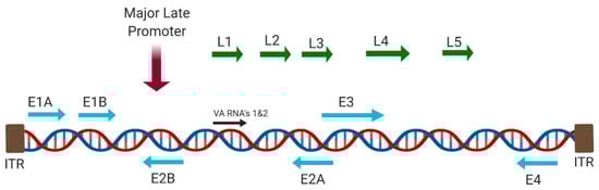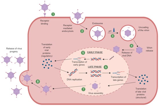 - Hoeben, R.C.; Uil, T.G. Adenovirus DNA replication. Cold Spring Harb. Perspect. Biol. 2013, 5, a013003. [Google Scholar] [CrossRef]